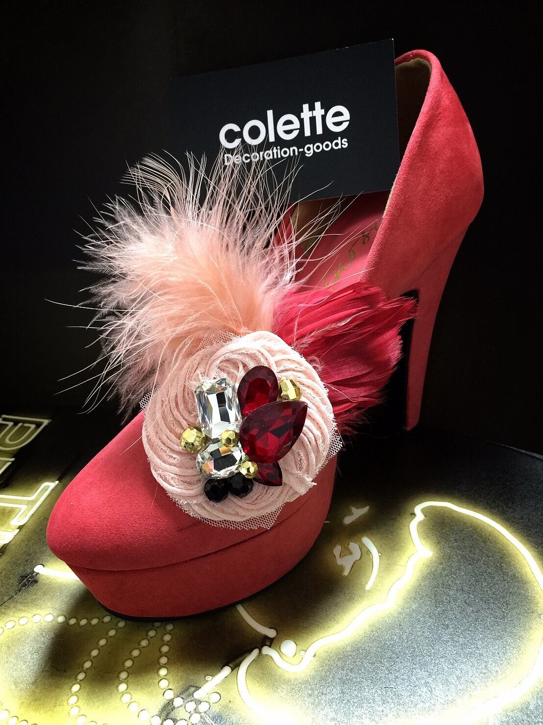 羽根×ビジュー◆シューズクリップ◇red×beige